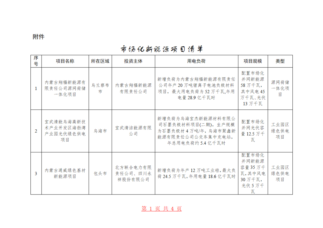 (一)內(nèi)蒙古翔福新能源有限責(zé)任公司源網(wǎng)荷儲一體化項目。新增負(fù)荷為內(nèi)蒙古翔福新能源有限責(zé)任公司年產(chǎn)20萬噸鋰離子電池負(fù)極材料項目,最大用電負(fù)荷為52萬千瓦,年用電量28.9億千瓦時,配置市場化并網(wǎng)新能源58萬千瓦,其中風(fēng)電45萬千瓦、光伏13萬千瓦,配建電化學(xué)儲能11.6萬千瓦/4小時。