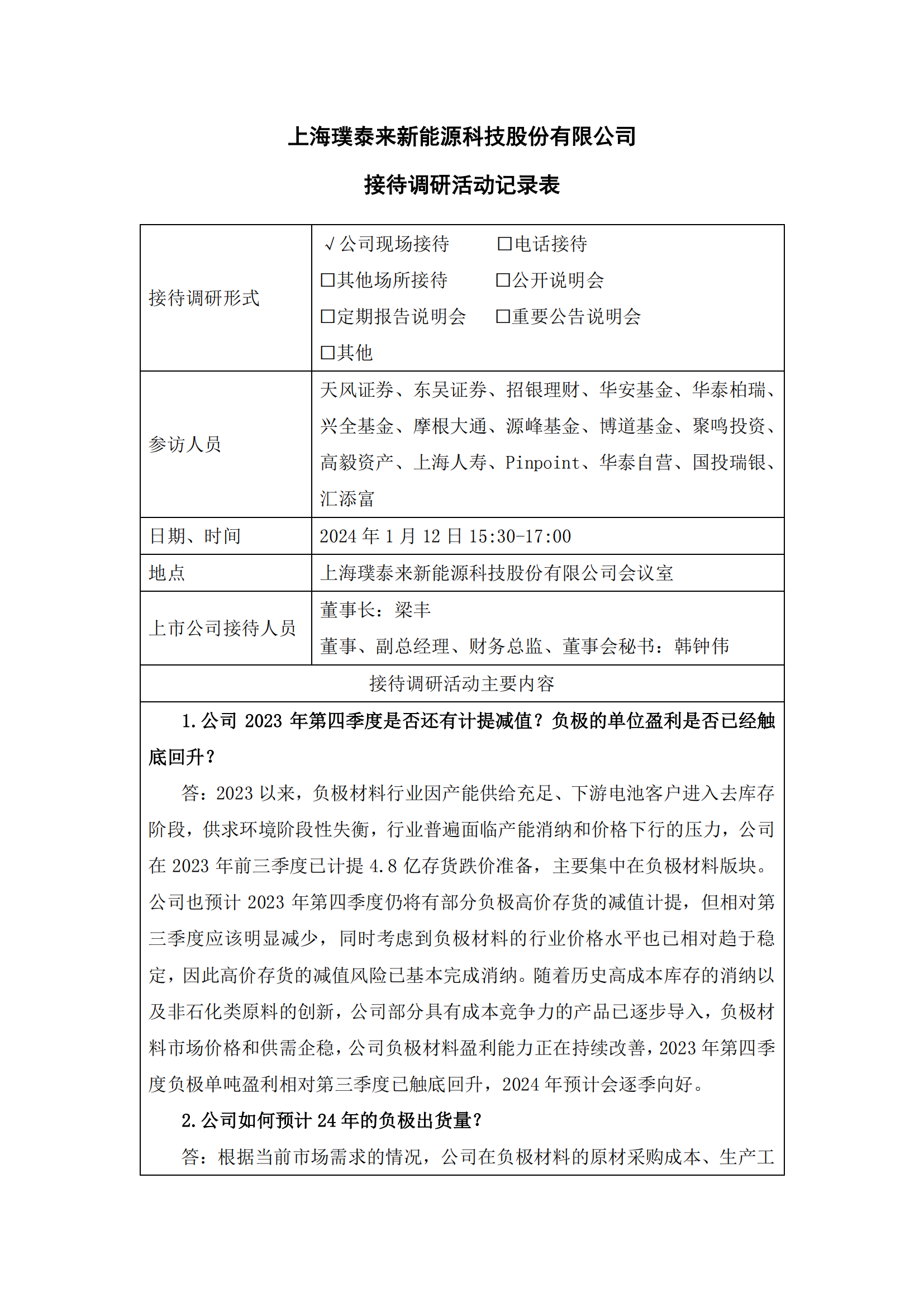 璞泰來1月15日發(fā)布消息,1月12日,公司接待天風(fēng)證券等多家機構(gòu)調(diào)研,接待人員董事長 梁豐,董事、副總經(jīng)理、財務(wù)總監(jiān)、董事會秘書 韓鐘偉,接待地點上海璞泰來新能源科技股份有限公司會議室。