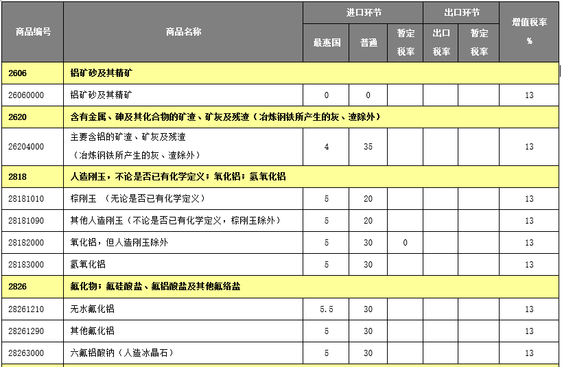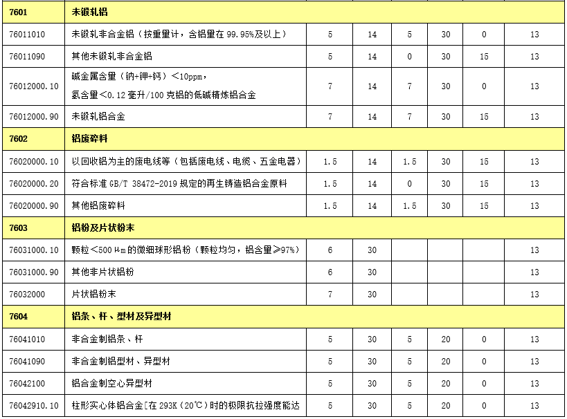 《中華人民共和國進(jìn)出口稅則》(2021年版)鋁相關(guān)商品關(guān)稅見下表。