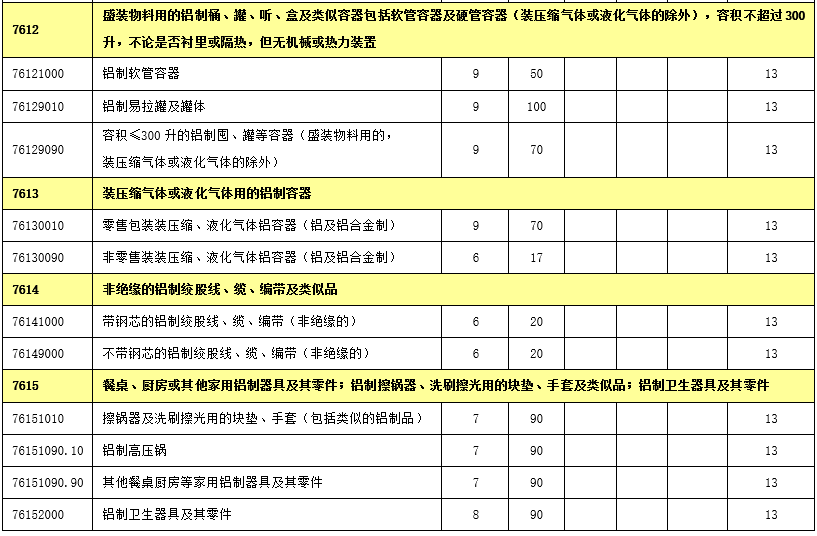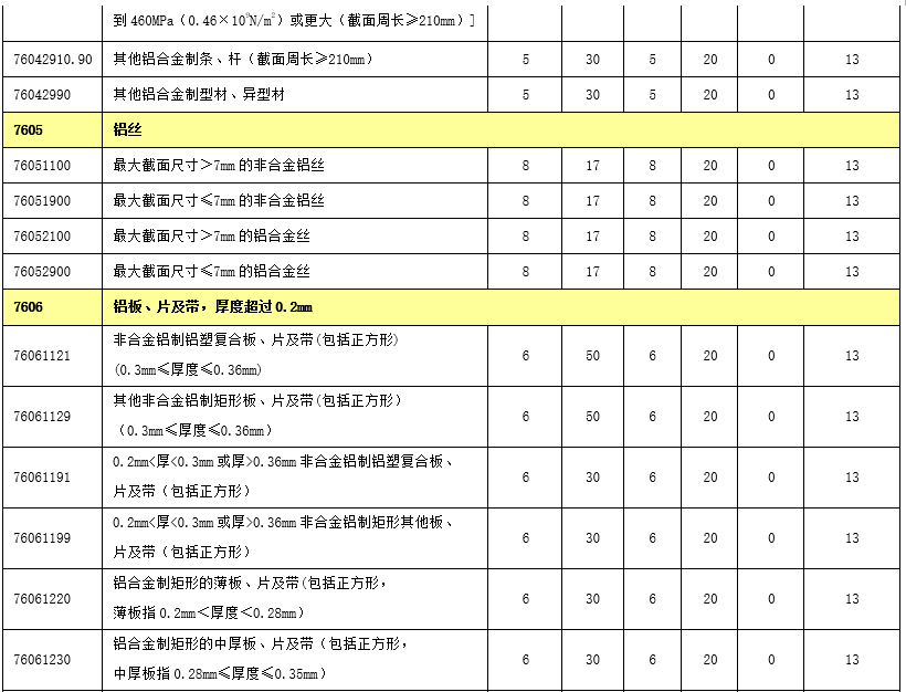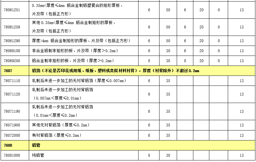 (1)稅則號為76061129的“其他0.3mm≤厚度<0.36mm的非合金鋁制矩形鋁板片帶”,進(jìn)口暫定關(guān)稅由2020年的4%上升至6%;