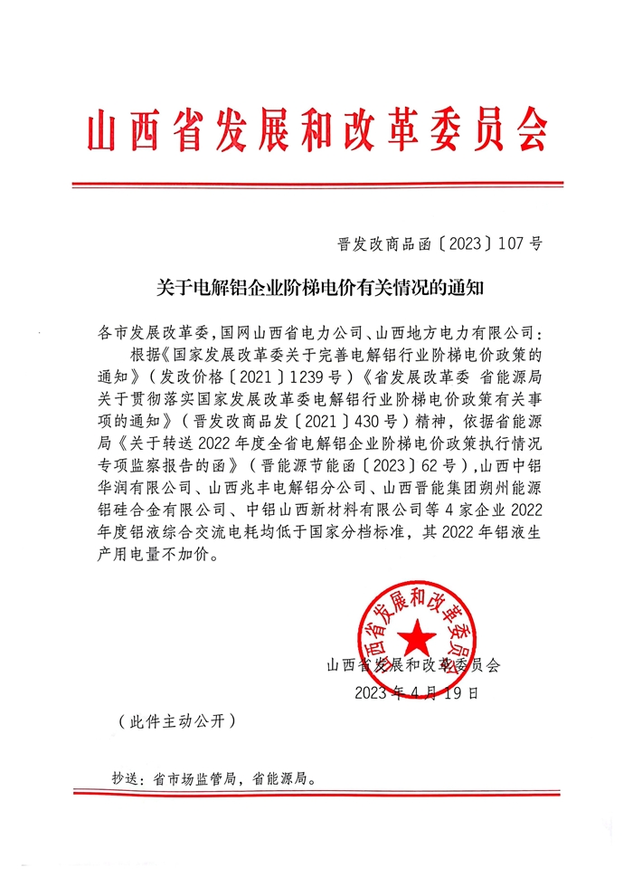 山西省關(guān)于電解鋁企業(yè)階梯電價有關(guān)情況的通知