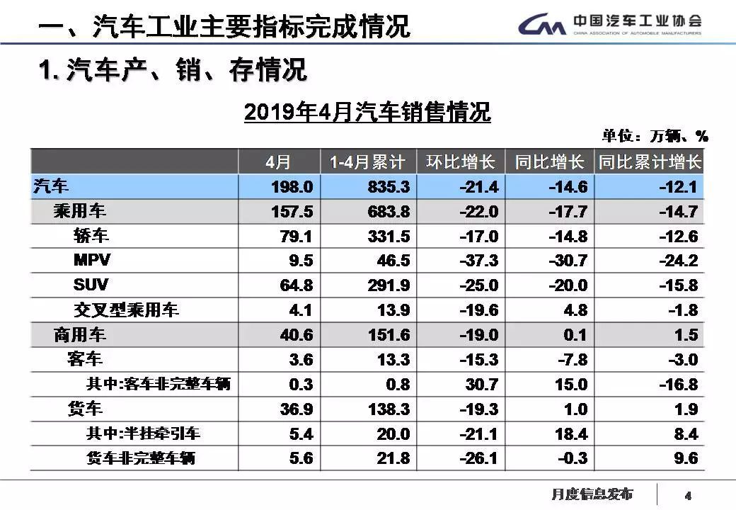 1、汽車整體:4月銷量198萬(wàn)輛,下降14.6%;1-4月銷量835.3萬(wàn)輛,下降12.1%;