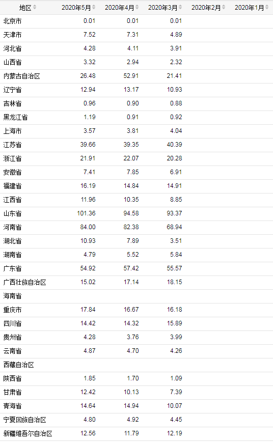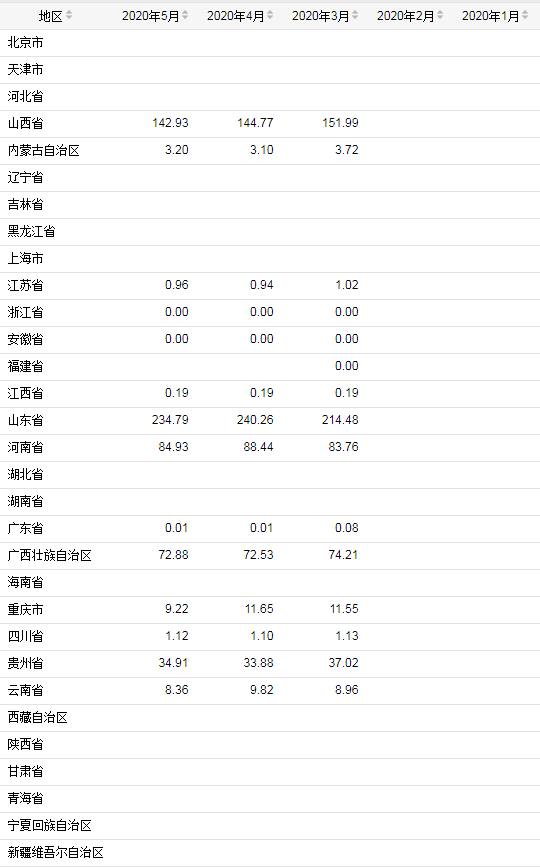 氧化鋁分地區(qū)月度產(chǎn)量(單位:萬(wàn)噸)