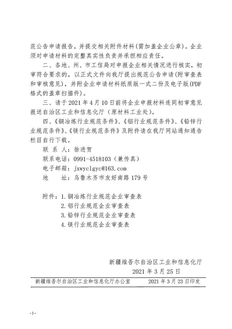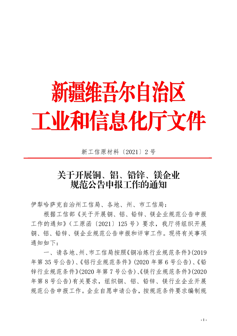 新疆關(guān)于開(kāi)展銅、鋁、鉛鋅、鎂企業(yè)規(guī)范公告申報(bào)工作的通知