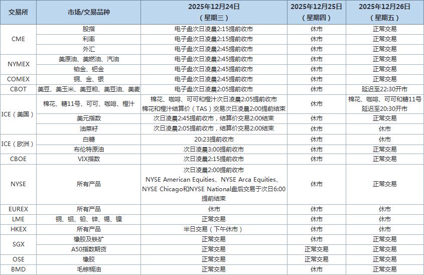12月25日(周四)適逢美國圣誕節(jié)假期,金融市場交易時間有所調(diào)整。