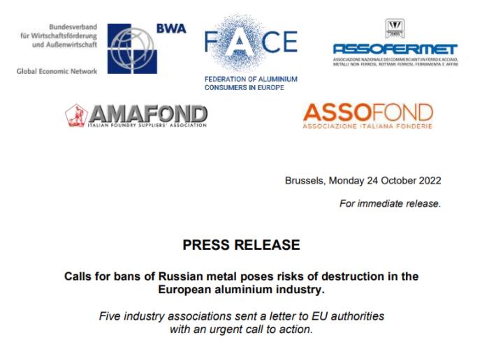 當(dāng)?shù)貢r間周一(10月24日),五家歐洲行業(yè)協(xié)會發(fā)表聯(lián)合聲明,鄭重呼吁歐盟阻止對俄羅斯的鋁禁運(yùn)、制裁、征收高額關(guān)稅等潛在的措施。