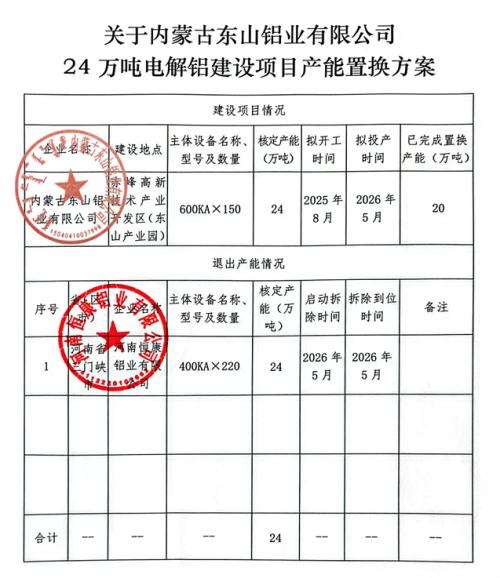 伊電控股集團有限公司通過集團內(nèi)部產(chǎn)能轉(zhuǎn)移的方式,將集團所屬河南省三門峽市陜州區(qū)河南恒康鋁業(yè)有限公司(以下簡稱:恒康鋁業(yè))24萬噸電解鋁產(chǎn)能轉(zhuǎn)移至內(nèi)蒙古東山鋁業(yè)有限公司(以下簡稱:東山鋁業(yè)),恒康鋁業(yè)和東山鋁業(yè)簽訂了集團內(nèi)部產(chǎn)能轉(zhuǎn)移協(xié)議書并制定了產(chǎn)能置換方案,伊電控股集團向河南省工業(yè)和信息化廳報送了《伊電控股集團有限公司關于電解鋁產(chǎn)能退出的報告》(伊電集團〔2025〕17號),赤峰市工業(yè)和信息化局上報了《關于申請對內(nèi)蒙古東山鋁業(yè)有限公司24萬噸電解鋁產(chǎn)能置換方案進行公示公告的請示》(赤工信發(fā)〔2025〕102號)。按照《國務院辦公廳關于營造良好市場環(huán)境促進有色金屬工業(yè)調(diào)結構促轉(zhuǎn)型增效益的指導意見》(國辦發(fā)〔2016〕42號)和《工業(yè)和信息化部關于電解鋁企業(yè)通過兼并重組等方式實施產(chǎn)能置換有關事項的通知》(工信部原〔2018〕12號)相關要求,現(xiàn)將東山鋁業(yè)24萬噸電解鋁建設項目產(chǎn)能置換方案予以公示,歡迎社會公眾進行監(jiān)督。公示期自公示之日起10個工作日。