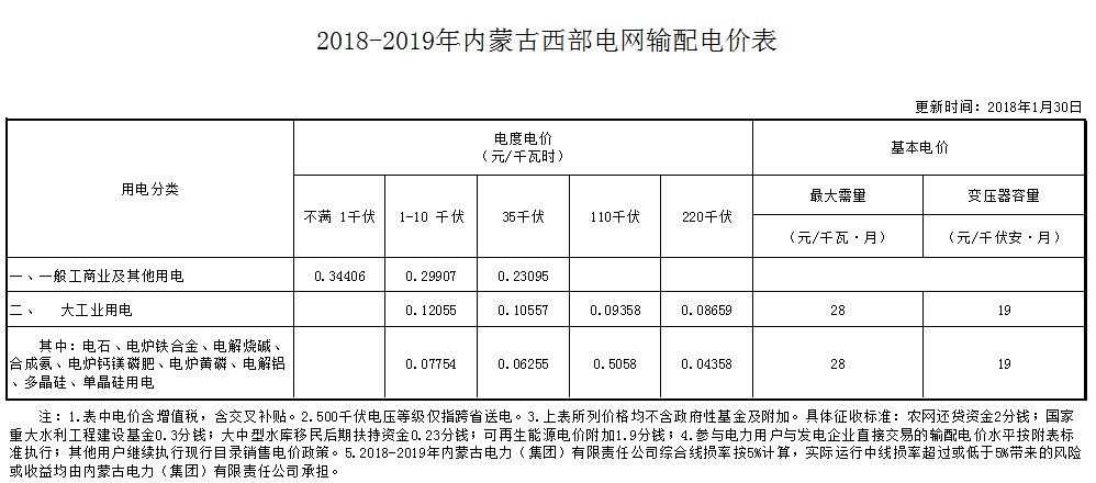 內(nèi)蒙古西部電網(wǎng)銷售電價表